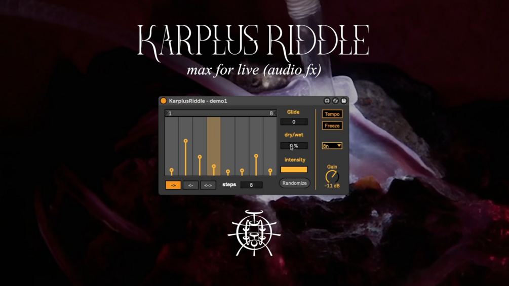 Karplus Riddle is an audio effect designed to sculpt rhythmic and evolving plucked or comb-like textures from any sound source. Built around a minimalist step-sequencer, it modulates micro-delay times per step, allowing for dynamic textural shifts, tempo variations, and gliding transitions.